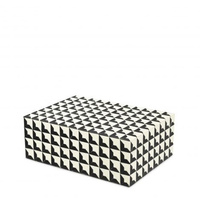 Czarno-biały wzór inkrustacji z żywicy Cabas S Box natychmiast przyciąga wzrok symetrycznym geometrycznym wzorem, który tworzy złudzenie optyczne.