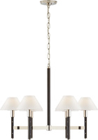Średni żyrandol Radford w kolorze polerowanego niklu i czarnego hebanu z lnianymi kloszami. Wykończenie: Polished Nickel and Black Ebony, Szerokość: 76.2cm, Wysokość: 61cm, Klosz: 7.6cm x 19.7cm x 12.1cm, Gniazdo: 6 - E14 Candelabra, Moc: 6 - 25 B, Kształ