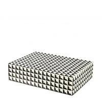 Czarno-biały wzór inkrustacji z żywicy Cabas S Box natychmiast przyciąga wzrok symetrycznym geometrycznym wzorem, który tworzy złudzenie optyczne.