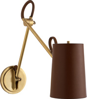 Pojedynczy kinkiet Riley z naturalnego mosiądzu i skóry siodłowej z lnianymi kloszami obszytymi skórą. Wykończenie: Natural Brass and Saddle Leather, Szerokość: 15.2cm, Wysokość: 31.1cm, Klosz: 10.2cm x 15.2cm x 14.6cm, Gniazdo: E14 Candelabra, Moc: 40 B,
