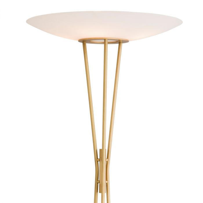Lampa podłogowa Collina emanuje stylowym, nowoczesnym tonem z połowy wieku. Lampa podłogowa Collina emanuje stylowym, nowoczesnym tonem z połowy wieku. Okrągła podstawa z trawertynu z trzema łodygami z antycznego mosiądzu stanowi przewiewną platformę dla klosza w kształcie misy z białego szkła. Elegancki design sprawia, że lampa ta nadaje się do wielu pomieszczeń w domu, w tym do przedpokoju, salonu lub sypialni.