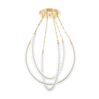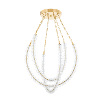Ten efektowny żyrandol inspirowany biżuterią doda natychmiastowego dramatyzmu nad głową. Przezroczyste, odlewane szklane koraliki są przewleczone przez zwisające rurki LED z wykończeniem w kolorze mosiądzu. Trzy rurki z koralikami są następnie nawleczone