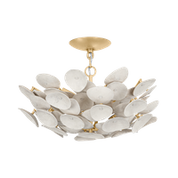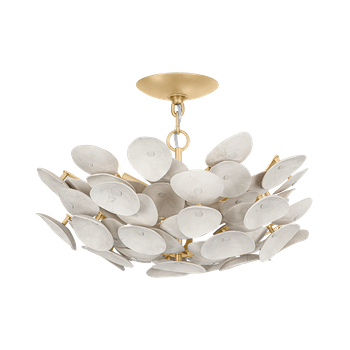 Delikatne dyski z bielonych muszli kokosowych otaczają ramę w stylu Vintage Gold Leaf, tworząc formę, która sprawia wrażenie zarówno organicznej, jak i wysokiej klasy. Dodaj kojący, luksusowy wygląd do każdego sufitu za pomocą tej nowoczesnej półprzeźrocz