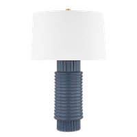 Spękana ceramika i ryflowanie sprawiają, że ta klasyczna sylwetka jest bardzo aktualna. Niebieski odcień gromadzi się w pęknięciach i żebrowaniach, tworząc wymiar i wspaniały efekt tekstury. Umieść tę lampę na dowolnym blacie, ladzie lub szafce nocnej, ab