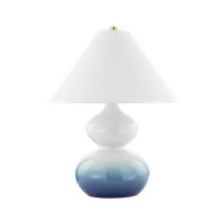 Inspirowany antycznymi dekoracyjnymi słoikami, kształt klepsydry Aimee i niebieska ombre ceramiczna podstawa nadają tej eleganckiej lampie stołowej kojący, rzeźbiarski wygląd. Zwężający się klosz z białego lnu i masywne zwieńczenie z postarzanego mosiądzu
