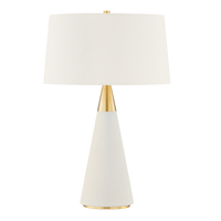 Bawiąc się fakturą, tonem i kształtem, Annabelle ma zwężający się naturalny lniany klosz na zaokrąglonej ceramicznej podstawie w kolorze kości słoniowej. Wypukłe kropki i subtelne pęknięcia w wykończeniu są zabawne i szykowne. Ta urocza lampa stołowa jest