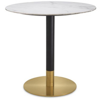 Dzięki okrągłemu blatowi z białego marmuru i zwężającej się mosiężnej podstawie, stół do jadalni Nathan zawiera w sobie esencję współczesnego designu.