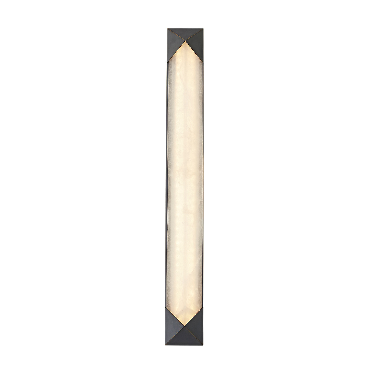 • Duży kinkiet LED z kolekcji Caesar to smukła, wertykalna forma z geometrycznym akcentem. Wydłużony klosz z alabastru osadzony został między trójkątnymi detalami w wykończeniu miejski brąz. Subtelne światło przenikające przez kamień tworzy nastrojową aurę