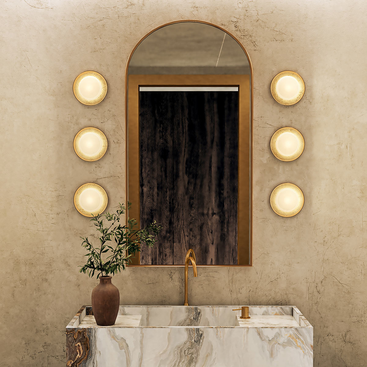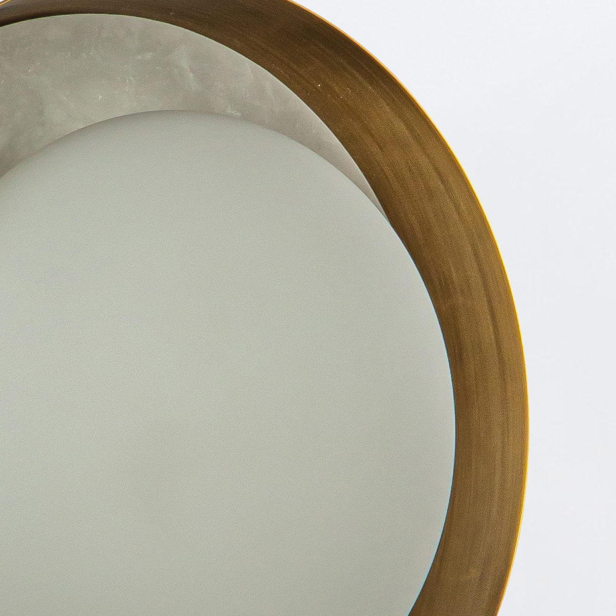 - Kinkiet z 2 źródłami światła z kolekcji Alonso wyróżnia się nowoczesną geometrią i ciepłym wykończeniem w kolorze vintage mosiądz. Półkolisty alabastrowy klosz z miękkim efektem rozproszenia światła kontrastuje z precyzyjnie wyprofilowaną metalową ramą. T