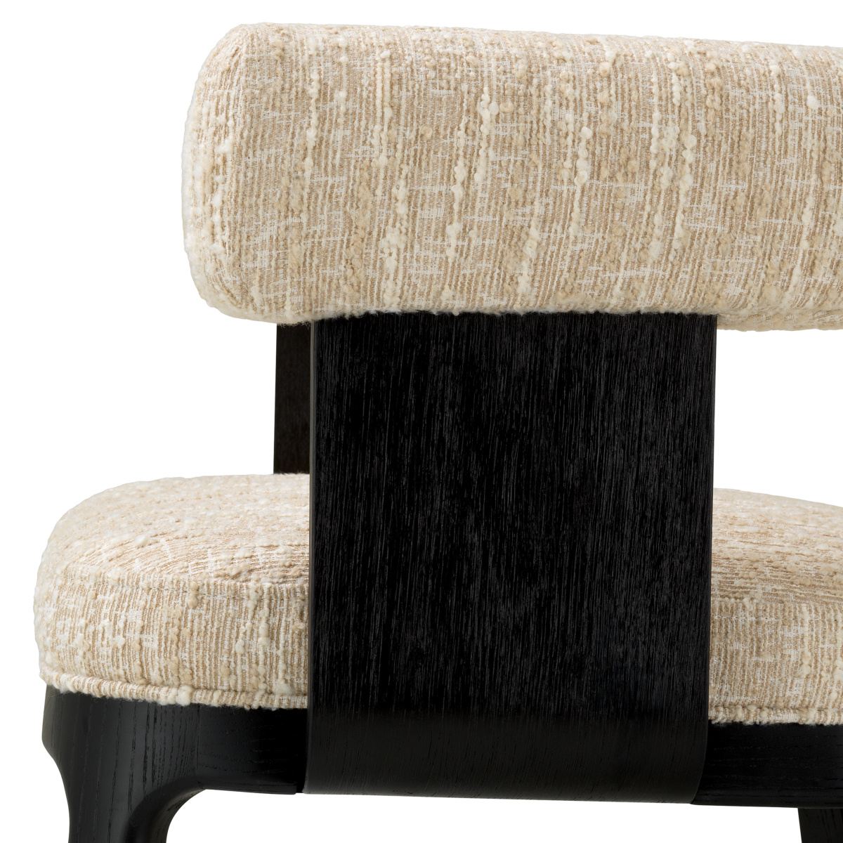 Zanurz się w luksusie z krzesłem do jadalni Dubois i spraw, by każdy posiłek stał się wykwintnym doznaniem. Zanurz się w luksusie z krzesłem do jadalni Dubois i spraw, by każdy posiłek stał się wykwintnym doznaniem. Z luksusową poduszką bouclé Sonata Cream, materiałem używanym w kilku elementach kolekcji, co ułatwia ich łączenie i dopasowywanie. Nogi wykonane są z litego drewna, a boki wykończone są fornirem z czarnego dębu. Połącz ze stołem jadalnym Eichholtz, aby nadać jadalni nieograniczony komfort i luksusowy styl.