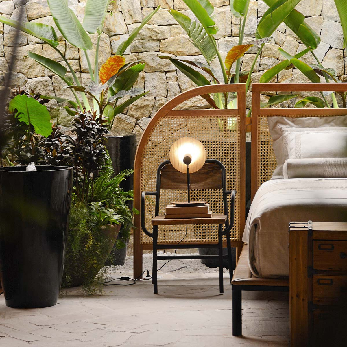 - Lampa stołowa Dot ma abstrakcyjny kształt i fornirowaną drewnianą płytę tylną z drewna tekowego, z której miękko rozprasza światło karbonowa stalowa reflektorowa oprawa.