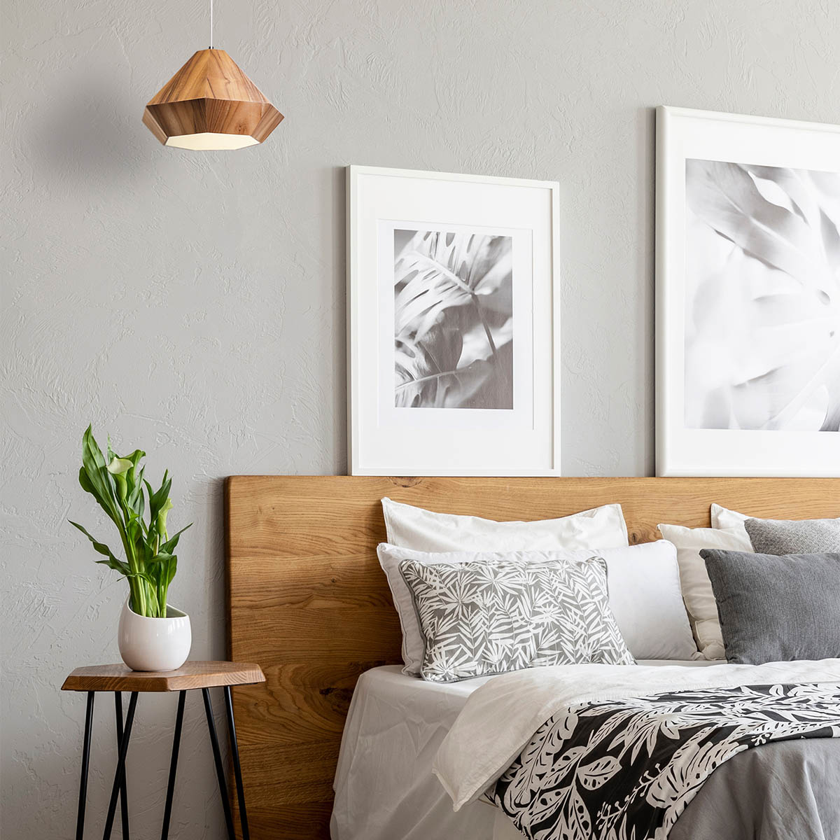 • Lampa wisząca Diamond o stożkowym kształcie wykonana z forniru tekowego, wzbogacona o fasetowane detale, które dodają głębi i elegancji zarówno nowoczesnym, jak i retro wnętrzom.