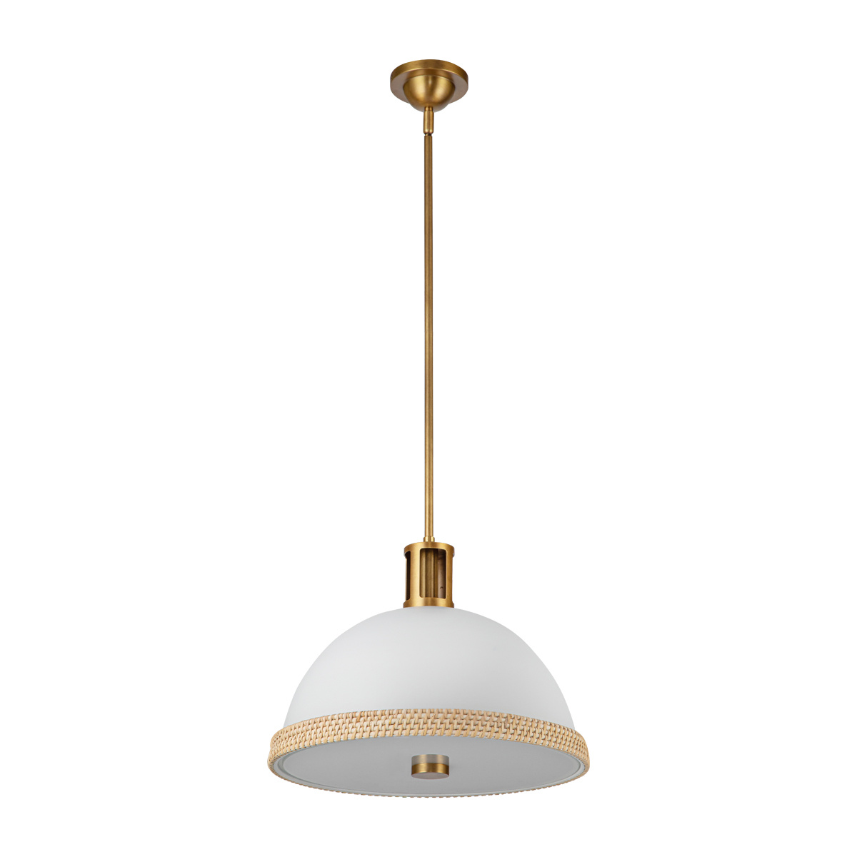 - Lampa wisząca z 2 źródłami światła z kolekcji Doral w wykończeniu matowa biel i vintage mosiądz przyciąga wzrok subtelnym połączeniem nowoczesności i form inspirowanych naturą. Charakterystyczny detal z rattanu oplata dolną krawędź klosza, a drobne perfor