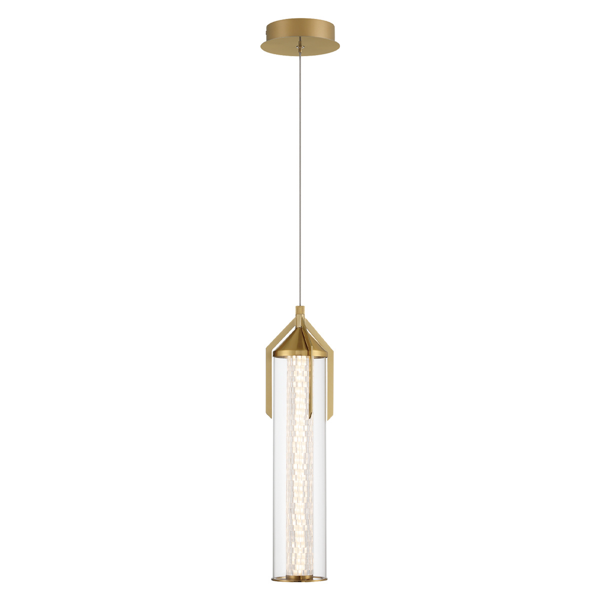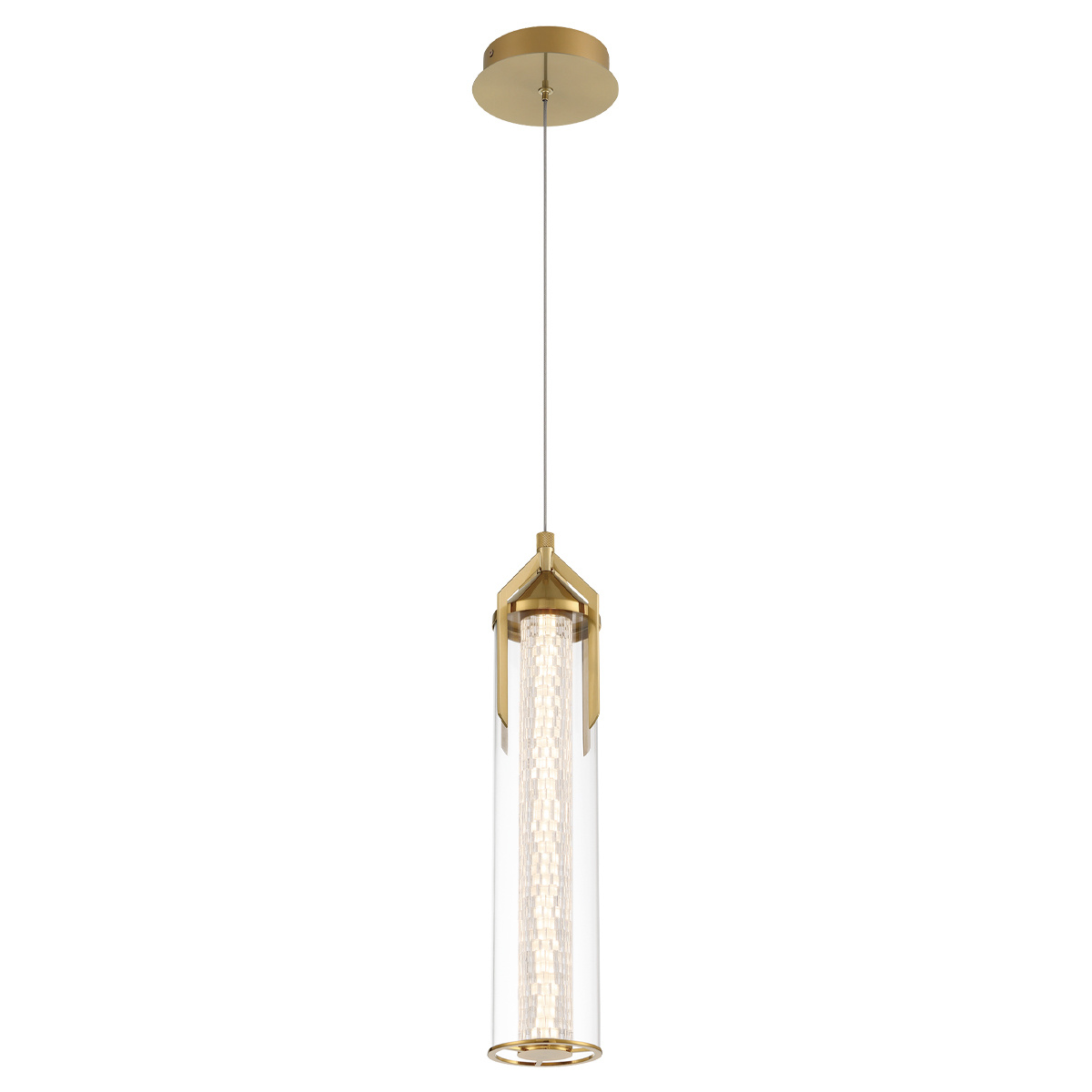 Lampa wisząca Espada - Szczotkowane złoto: elegancka lampa wisząca o wysokości 505 mm i średnicy 150 mm, z wbudowanym źródłem światła LED o mocy 18W. Emituje 1064 lumenów przy temperaturze barwowej 3000K, z możliwością ściemniania. Wykończenie w szczotkowanym złocie, klosz przezroczysty ze szkła. Idealna do salonu, jadalni, sypialni.