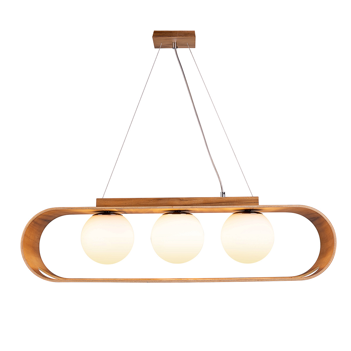 Lampa wisząca Sfera: nowoczesna lampa wisząca z forniru tekowego, szerokość 850mm, głębokość 200mm, wysokość 200mm. Posiada 3 źródła światła E27 o maksymalnej mocy 40W każde. Idealna do salonu i jadalni w stylu nowoczesnym lub retro. Kolor brązowy, drewno.