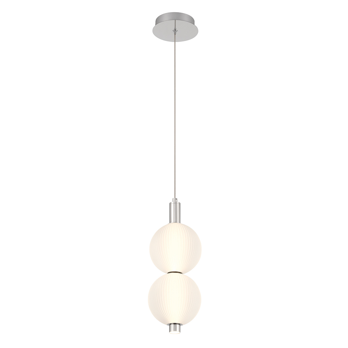 Mała lampa wisząca Palmas - 2 źródła światła: nowoczesna lampa o średnicy 152mm i wysokości 400mm, z wbudowanym źródłem światła LED o maksymalnej mocy 20W. Emituje 1266 lumenów przy temperaturze barwowej 3000K, z możliwością ściemniania. Wykończenie w polerowanym niklu, z białym kloszem ze szkła. Idealna do salonu, jadalni, sypialni i kuchni.