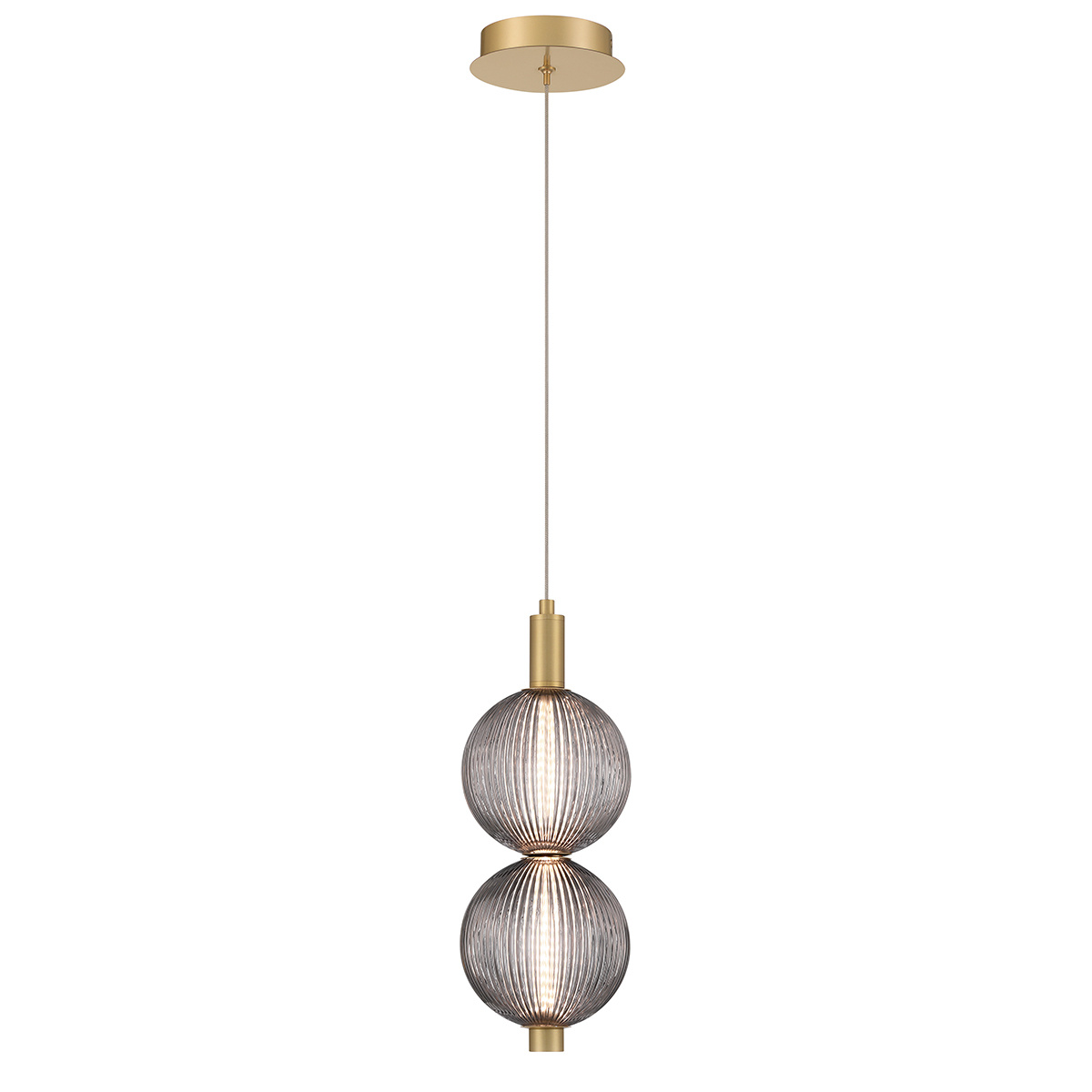 Mała lampa wisząca Palmas z 2 źródłami światła to nowoczesna oprawa w kolorze szczotkowanego złota z przydymionymi szklanymi kloszami. Wysokość lampy wynosi 400mm, a średnica 152mm. Lampa posiada wbudowane diody LED o maksymalnej mocy 20W, emitujące 1266 lumenów przy temperaturze barwowej 3000K i współczynniku CRI 92. Jest ściemnialna, zasilana napięciem sieciowym 220-240 V 50 Hz. Wysokość regulowana podczas montażu za pomocą przewodu o długości 2438mm.