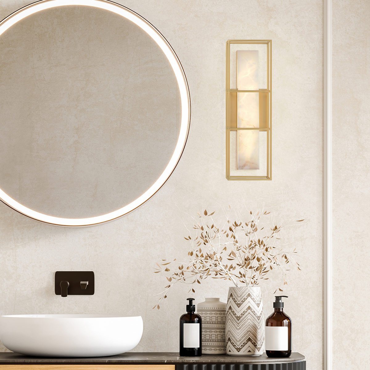 - W tym wyjątkowym projekcie połączono elementy organiczne i przemysłowe. Miękkość jednego kawałka ręcznie rzeźbionego alabastru otoczona metalową ramą, symbolizuje yin i yang w designie.