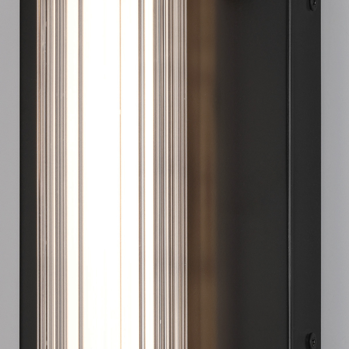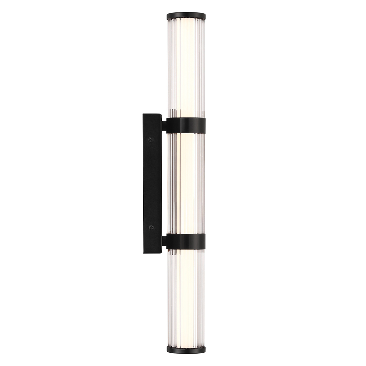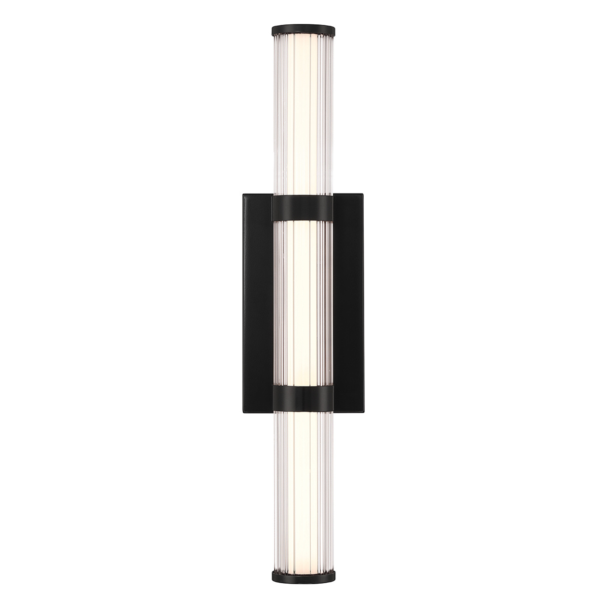 Średni kinkiet LED Fayton w matowej czerni. Wysokość 540mm, szerokość 90mm, głębokość 101mm. Wbudowane źródło światła LED o mocy 21,6W, 1477 lumenów, temperatura barwowa 3000K. Szkło przezroczyste. Idealny do wnętrz, łazienek i na zewnątrz.