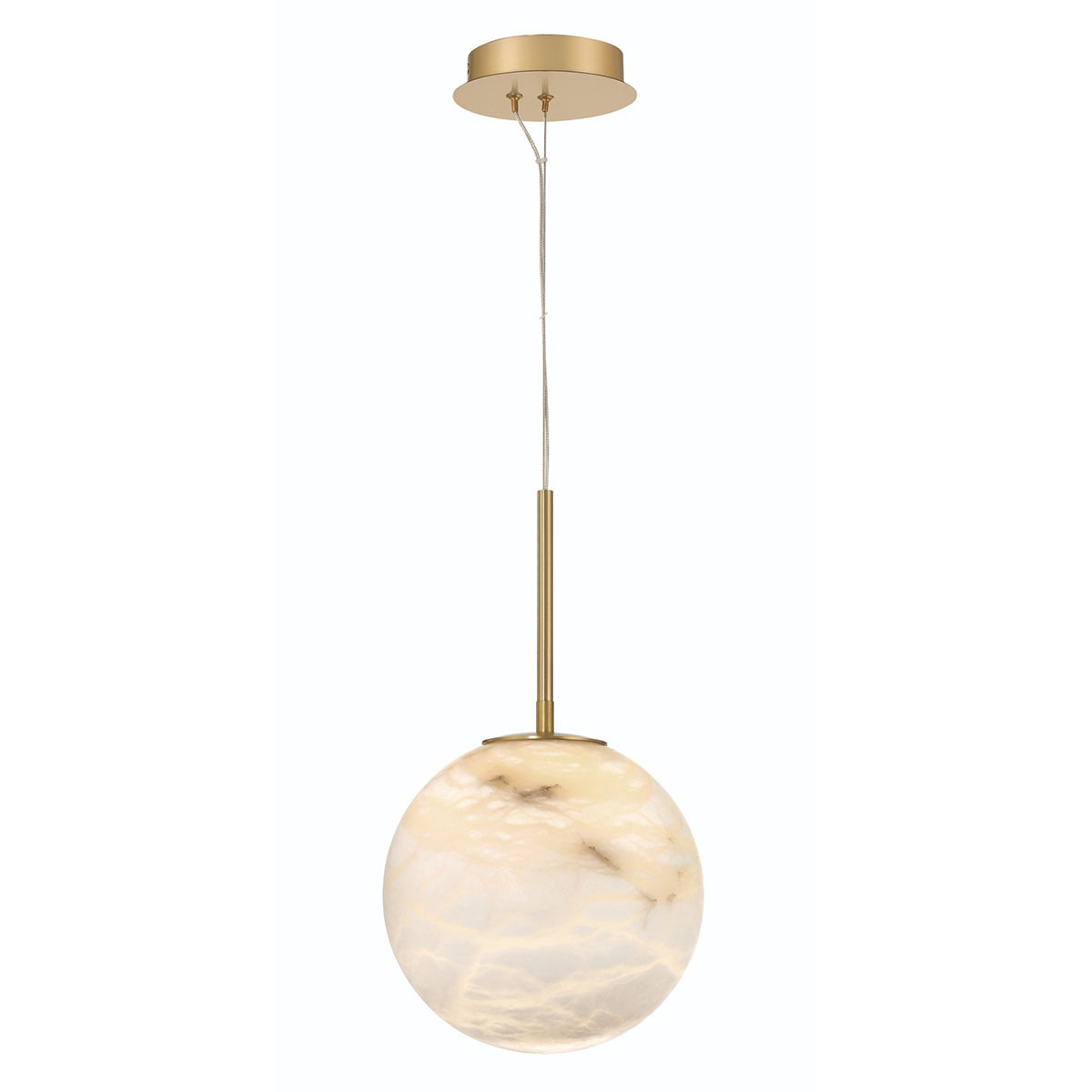 Nowoczesna lampa wisząca w szczotkowanym złocie, średnica 304 mm, wysokość 544 mm. Posiada wbudowane źródło światła LED o mocy 15W, strumień 1115 lumenów, temperatura barwowa 3000K, kąt padania światła 360 stopni. Materiał wykonania: stal i alabaster. Idealna do salonu, jadalni, sypialni. Możliwość ściemniania.