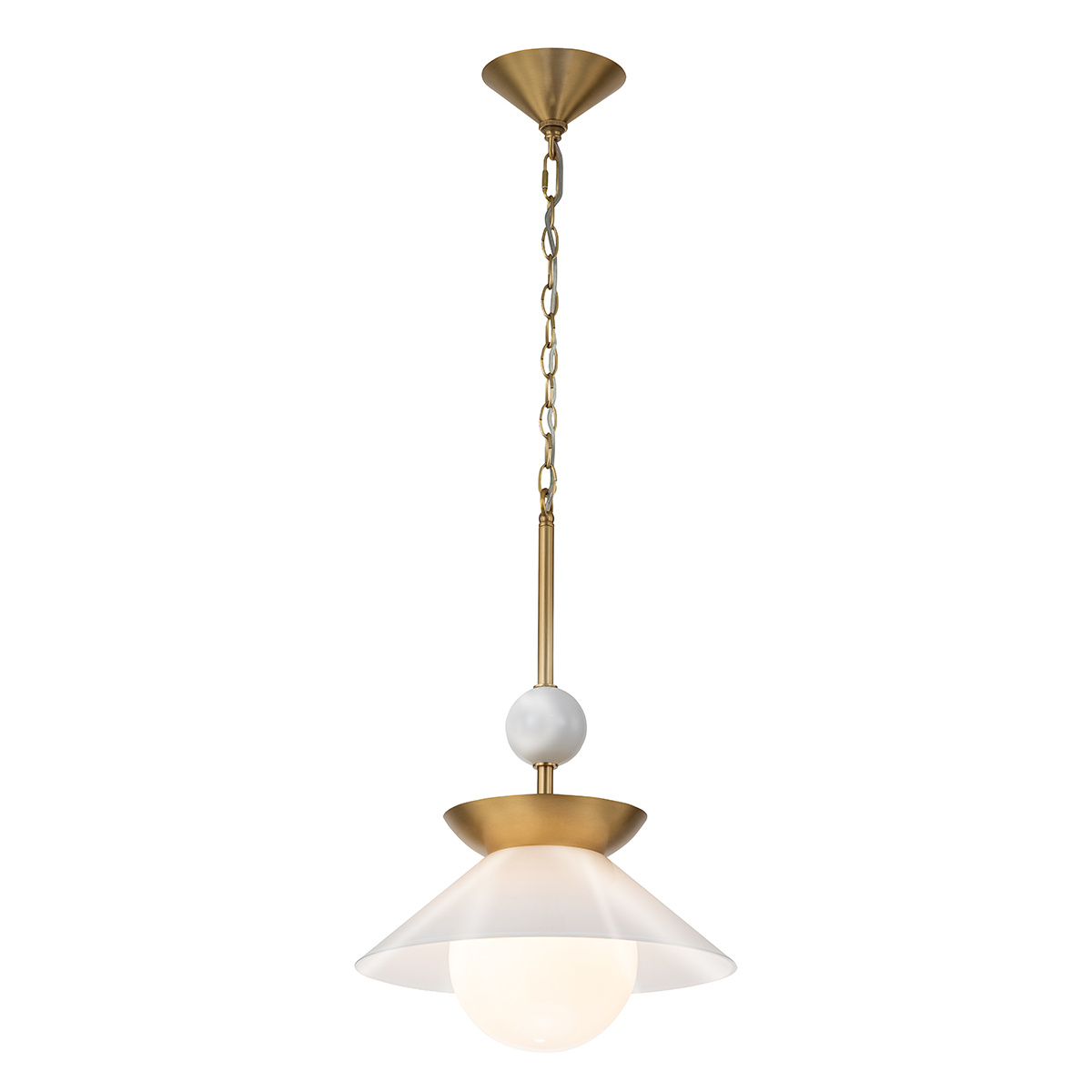 - Wprowadź do wnętrza odrobinę stylu mid-century modern dzięki lampie wiszącej Saucer z 1 źródłem światła w wykończeniu postarzany mosiądz. To efektowny model z opalowym szkłem i kulistym detalem, który przyciąga uwagę. Doskonała propozycja dla projektantów