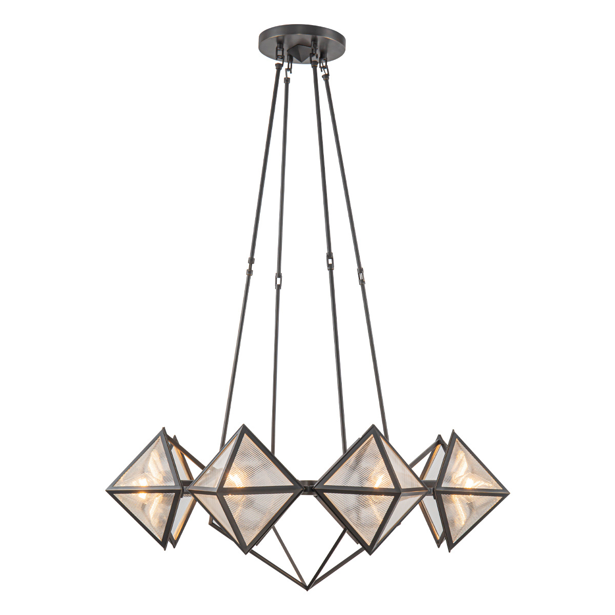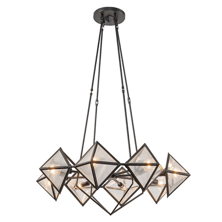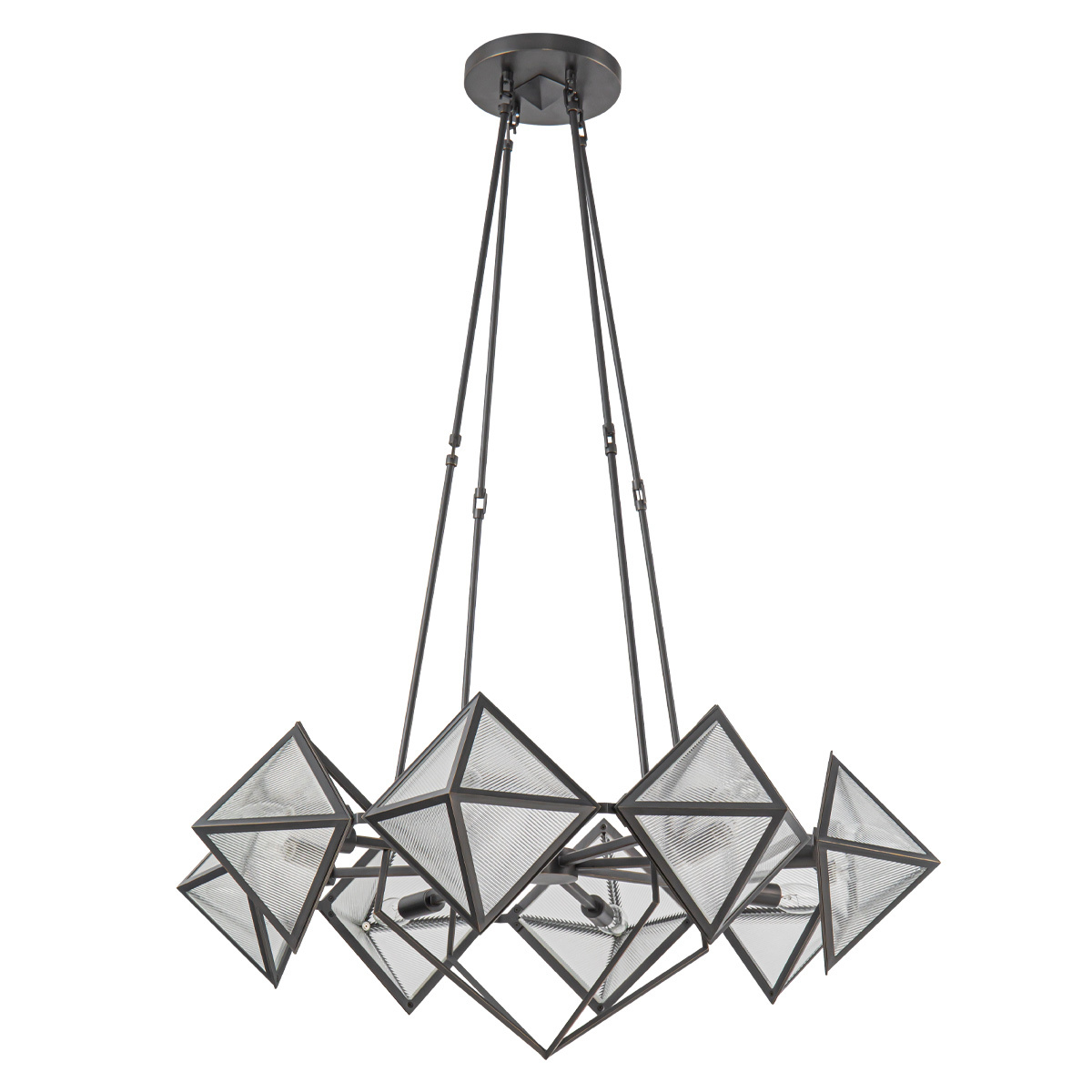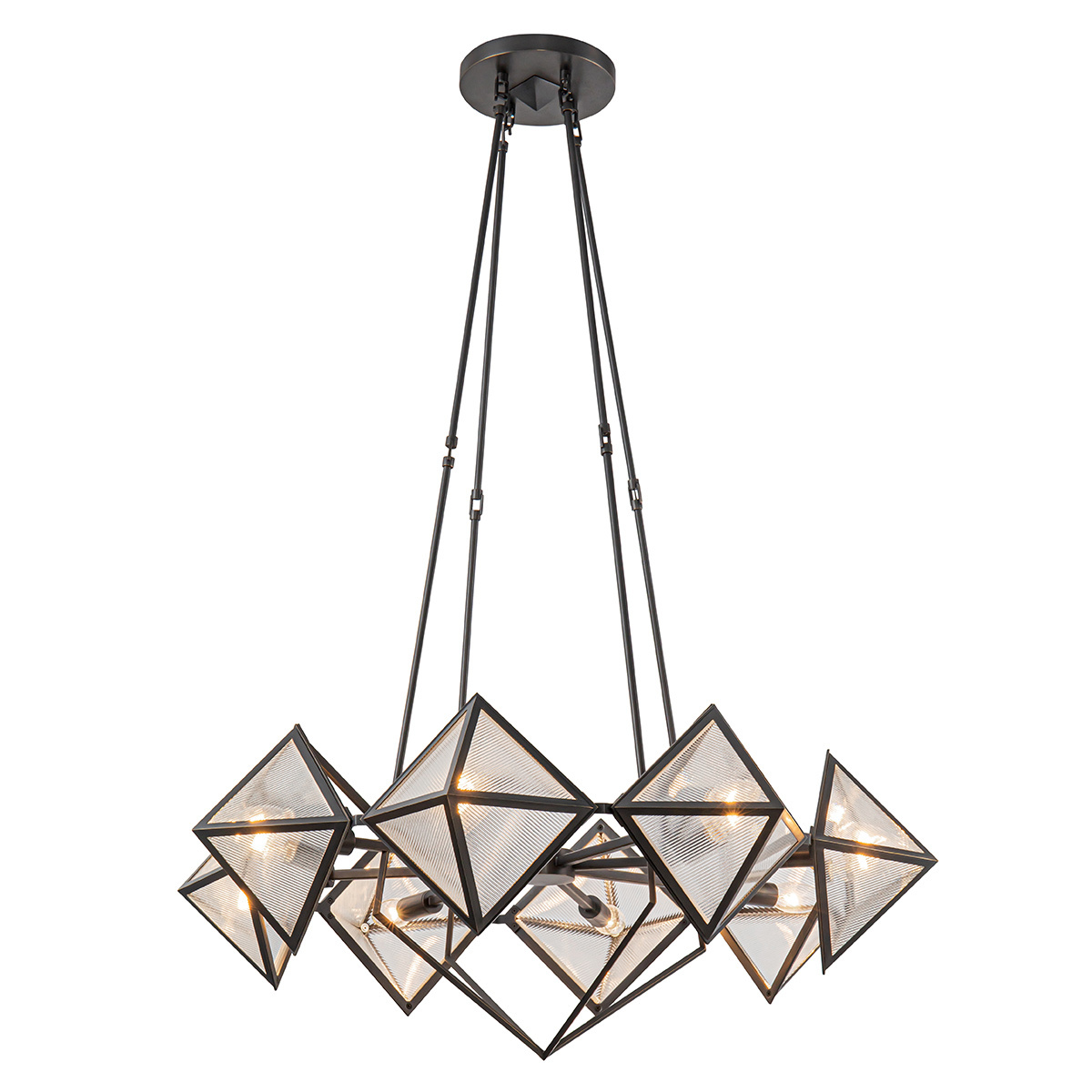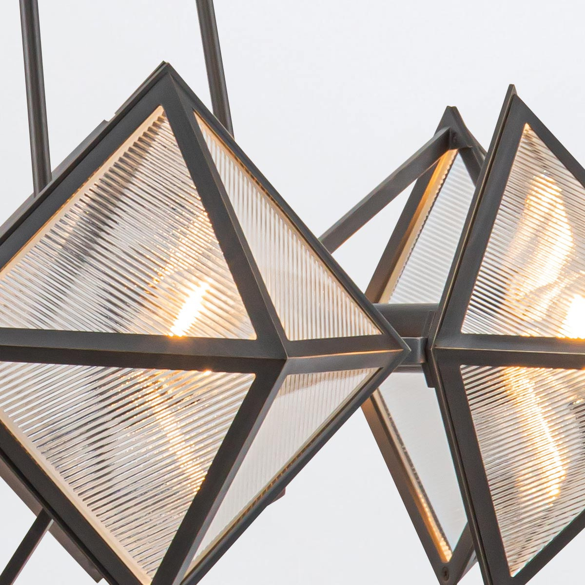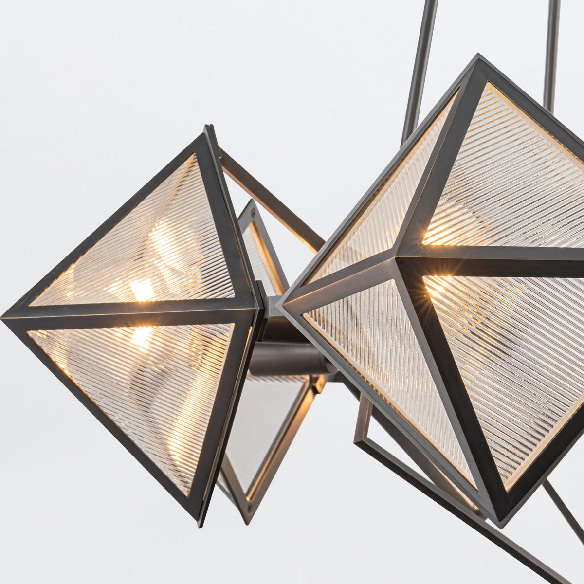 - Żyrandol z 8 źródłami światła z kolekcji Cairo łączy architektoniczną formę z eleganckimi materiałami. Geometria inspirowana kształtem piramidy została tu zbudowana z wielopłaszczyznowych paneli szkła ryflowanego i wyrazistej ramy w wykończeniu miejski br