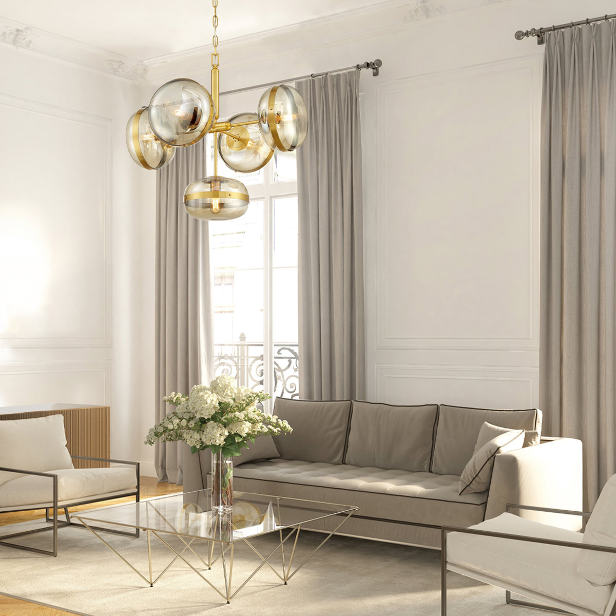 - Metalowa opaska otacza każdą szklaną kulę, pięknie odbijając ciepłe światło emitowane przez umieszczone wewnątrz żarówki w stylu vintage. Konstrukcja z metalu stanowi harmonijny kontrapunkt do surowego, minimalistycznego designu.