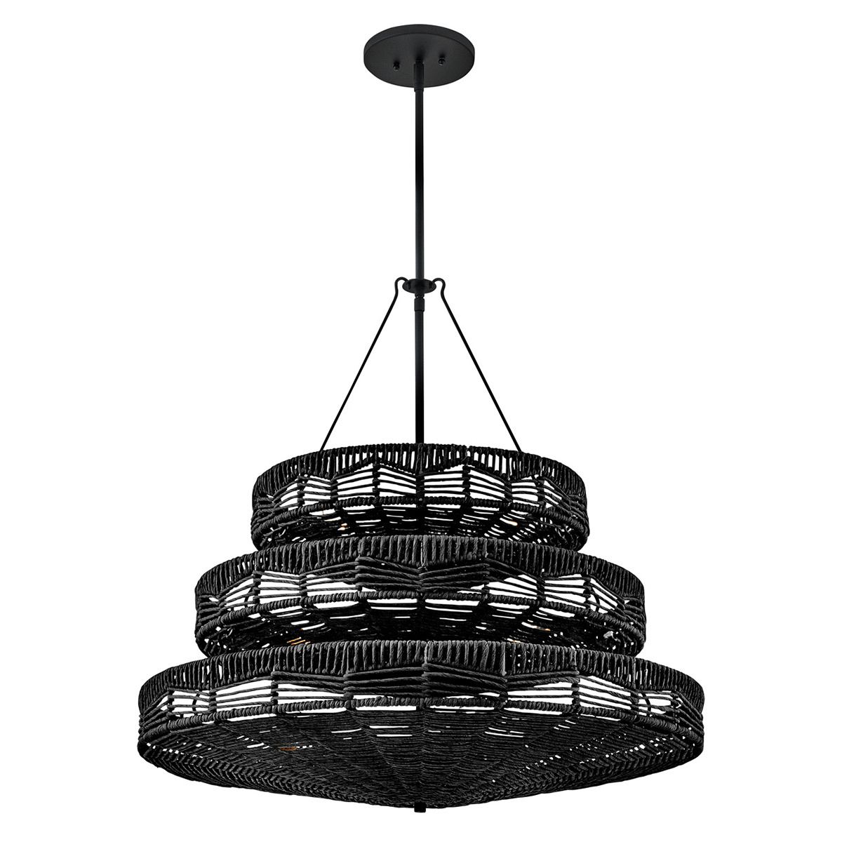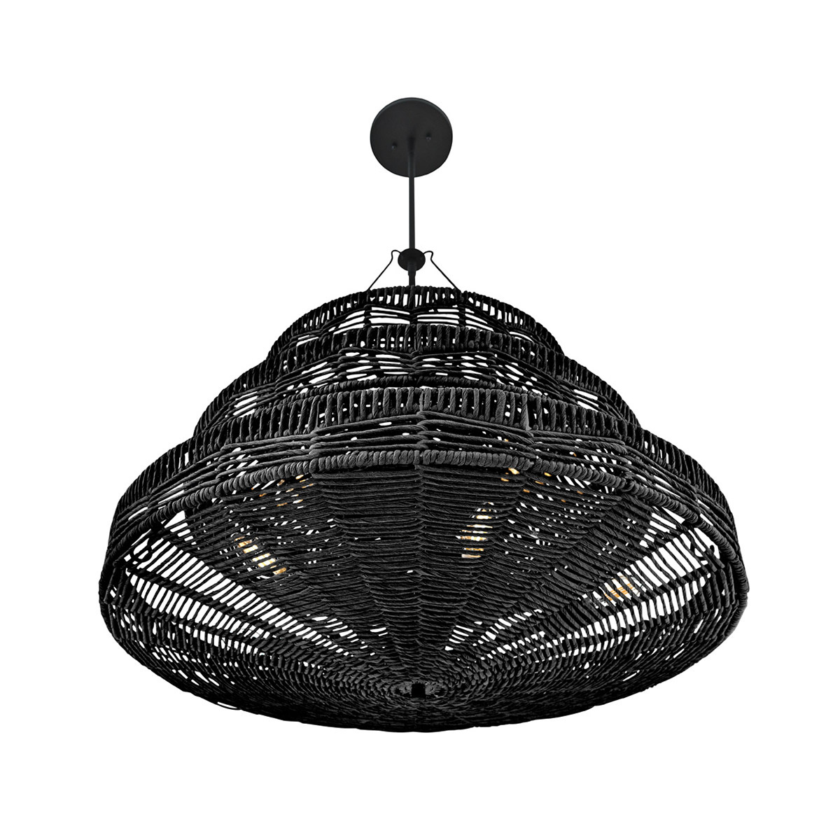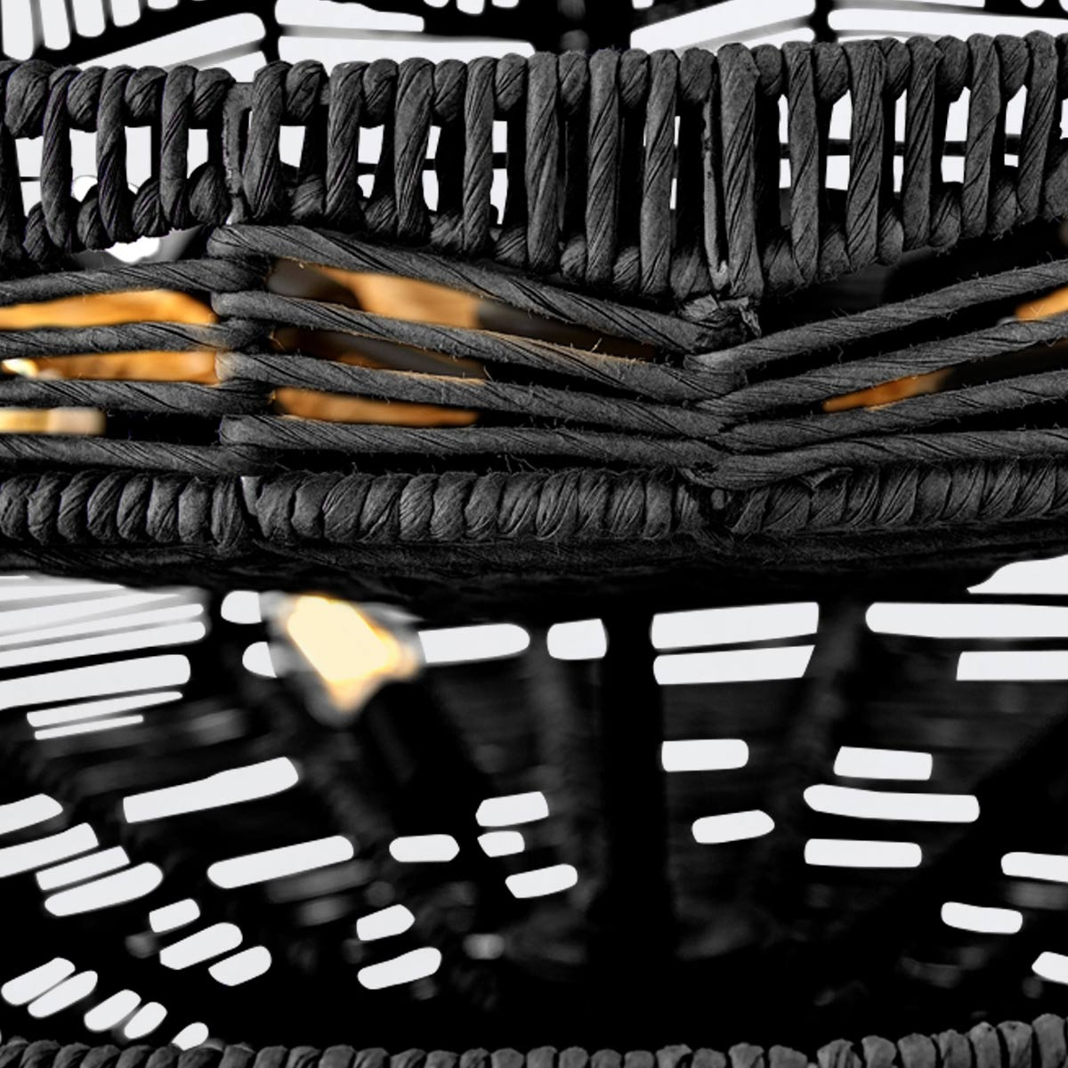 - Żyrandol Ophelia z 13 źródłami światła to efektowna czarna oprawa o intrygującej, ażurowej strukturze. Trzy kondygnacje ręcznie wyplatanego klosza z naturalnych włókien osadzono na geometrycznej ramie wykończonej w kolorze czarnym. Lampa emanuje organiczn