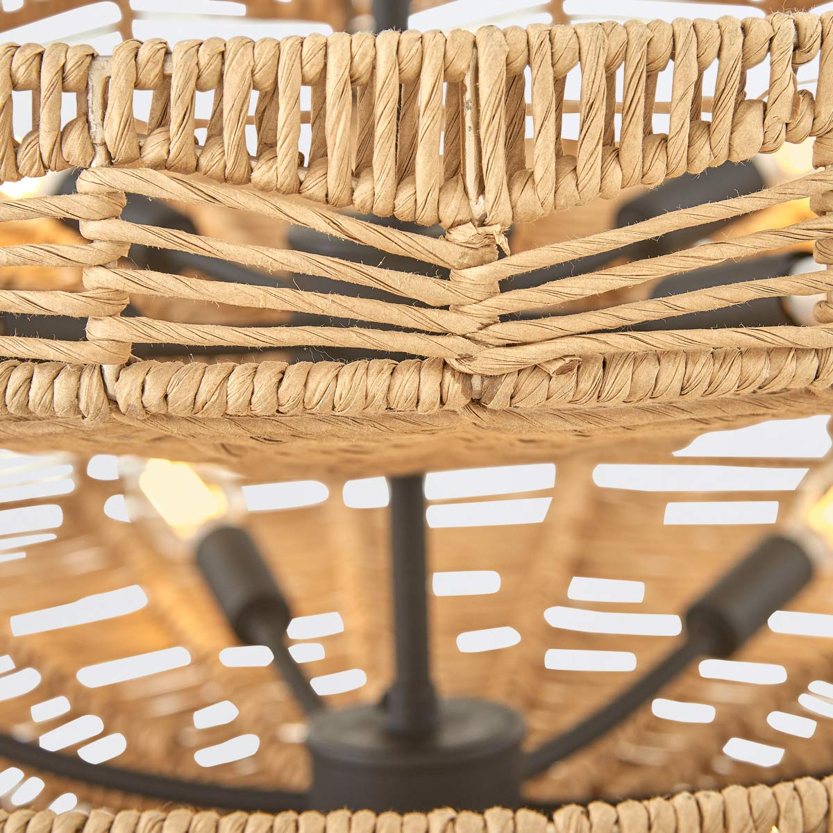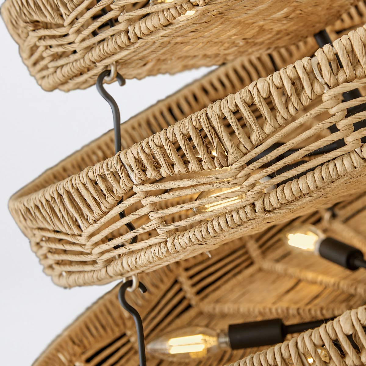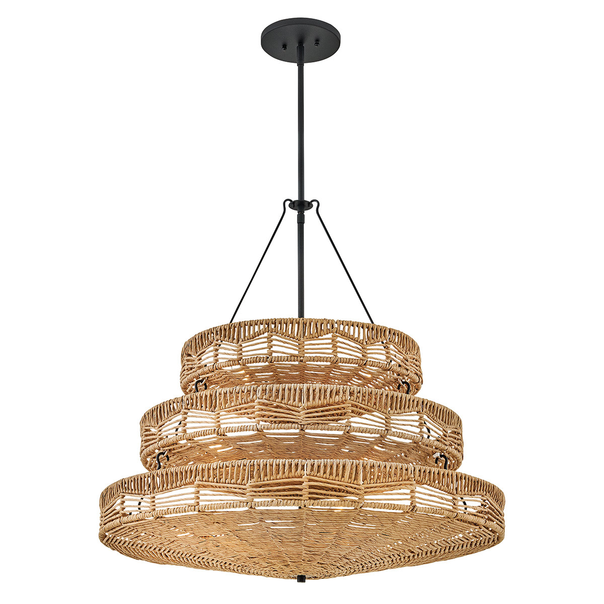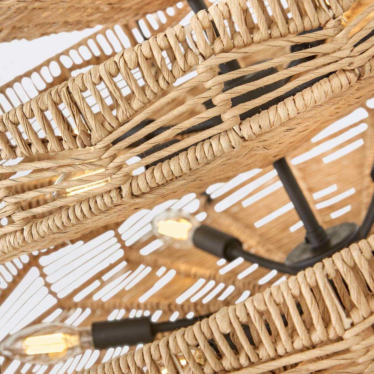 - Żyrandol Ophelia z 13 źródłami światła przyciąga wzrok ręcznie plecionym kloszem w odcieniach karmelowego beżu. Trzypoziomowa czarna konstrukcja przypominająca kosze tworzy imponującą sylwetkę, która łączy naturalną estetykę z eleganckim wykończeniem. Ide