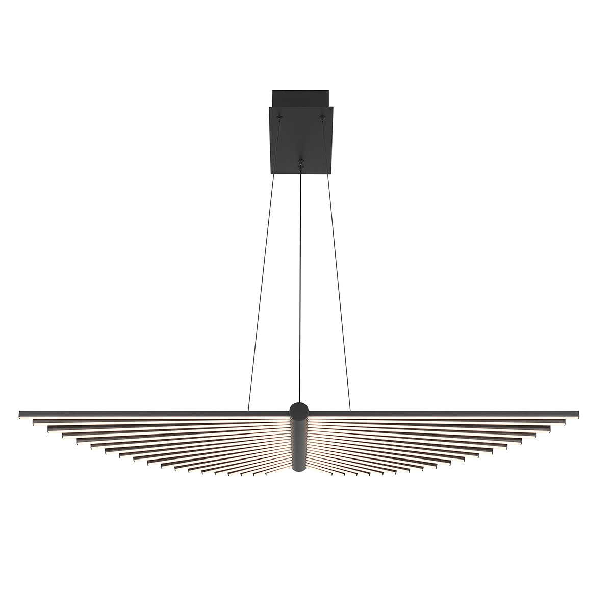 Żyrandol Seraph w matowej czerni, o szerokości 1050 mm i głębokości 275 mm, z wbudowanym źródłem światła LED o mocy 57W. Emituje 1192 lumeny przy temperaturze barwowej 3000K, z możliwością ściemniania i regulacją wysokości podczas montażu. Idealny do wnętrz.
