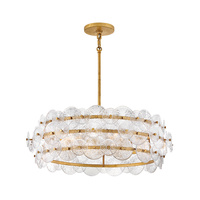 Żyrandol Rene z 16 źródłami światła w wykończeniu przecierany mosiądz to dekoracyjna i pełna blasku forma, która tworzy spektakularny efekt w przestrzeniach z wysokim sufitem. Konstrukcja opiera się na kilku warstwach tłoczonych, szklanych dysków, które o